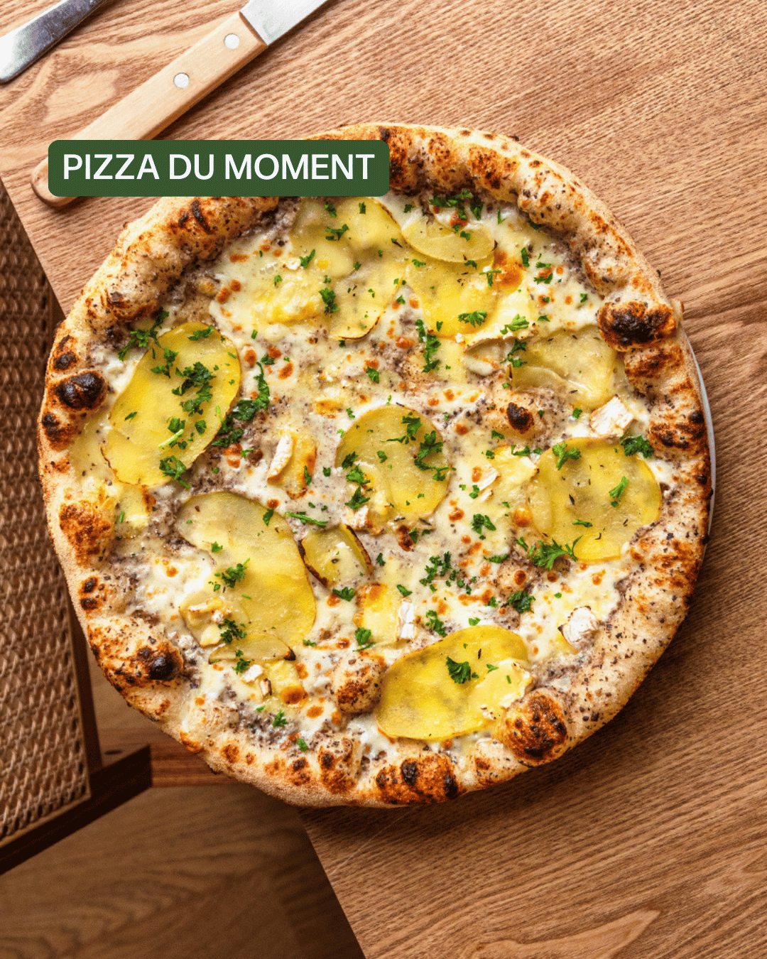 Crème fraîche à la truffe*, mozzarella fior di latte, pommes de terre cuisinées, camembert de Normandie AOP au lait cru, après cuisson : persil frais. *préparation à base de crème fraîche et de sauce à la truffe d'été 5%